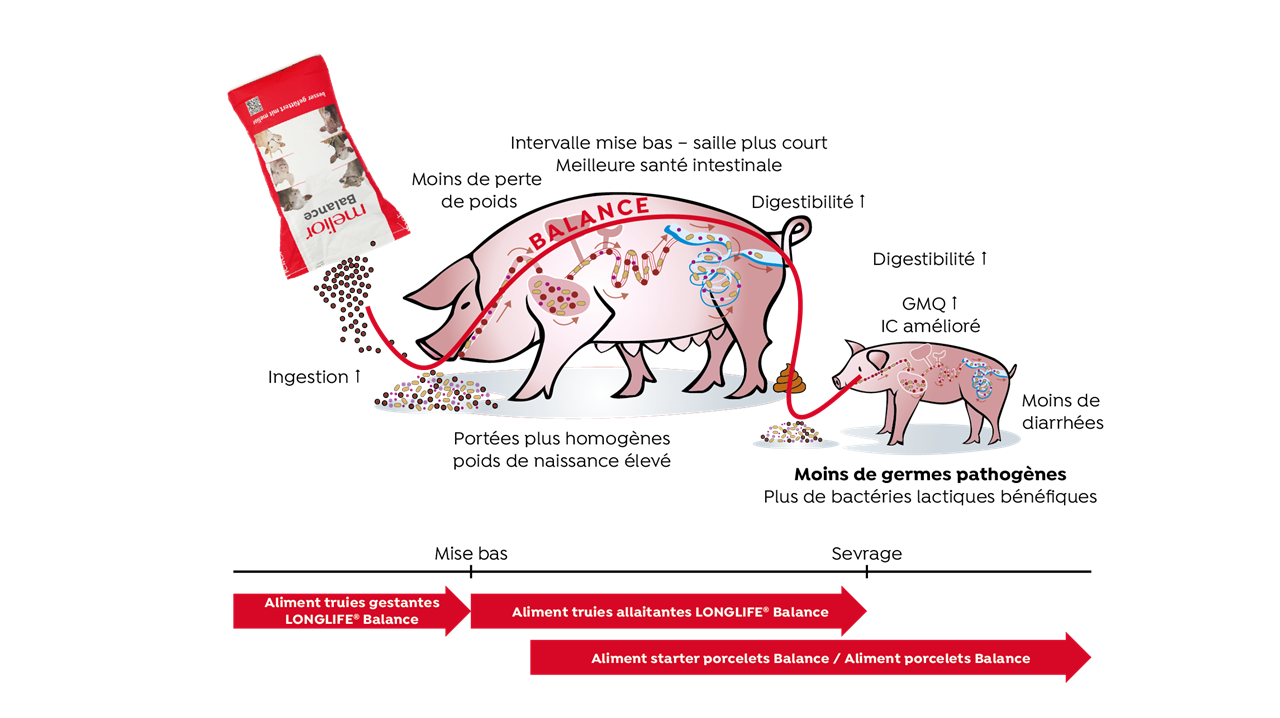 Un autre élément essentiel à la santé intestinale est un concept d'alimentation qui renforce précocement le microbiote intestinal. Si la truie reçoit des probiotiques dès la gestation, son intestin devient plus stable et elle excrète moins de germes pathogènes. Au contact de leur environnement, les porcelets absorbent des composants microbiologiques utiles dès les premières heures de vie. La colonisation de l'intestin est ainsi orientée très tôt dans la bonne direction. Un microbiote intestinal équilibré renforce la digestion, le système immunitaire et les performances. À partir de la première semaine de vie, l'apport en probiotiques doit être poursuivi via l'alimentation de démarrage afin que les porcelets continuent à développer leur stabilité et leur résistance.