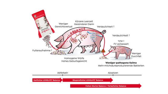 Ein weiterer Baustein der Darmgesundheit ist ein Fütterungskonzept, das die Darmmikrobiota früh stärkt. Erhält die Sau bereits während der Trächtigkeit Probiotika, wird ihr Darm stabiler, und sie scheidet weniger pathogene Keime aus. Über den Kontakt mit der Umgebung nehmen Ferkel in den ersten Lebensstunden nützliche mikrobiologische Bestandteile auf. So wird die Besiedlung des Darms früh in die richtige Richtung gelenkt. Eine ausgewogene Darmmikrobiota stärkt Verdauung, Immunsystem und Leistungsfähigkeit. Ab der ersten Lebenswoche sollte die Aufnahme von Probiotika über das Starterfutter fortgesetzt werden, damit die Ferkel Stabilität und Widerstandskraft weiter ausbauen.