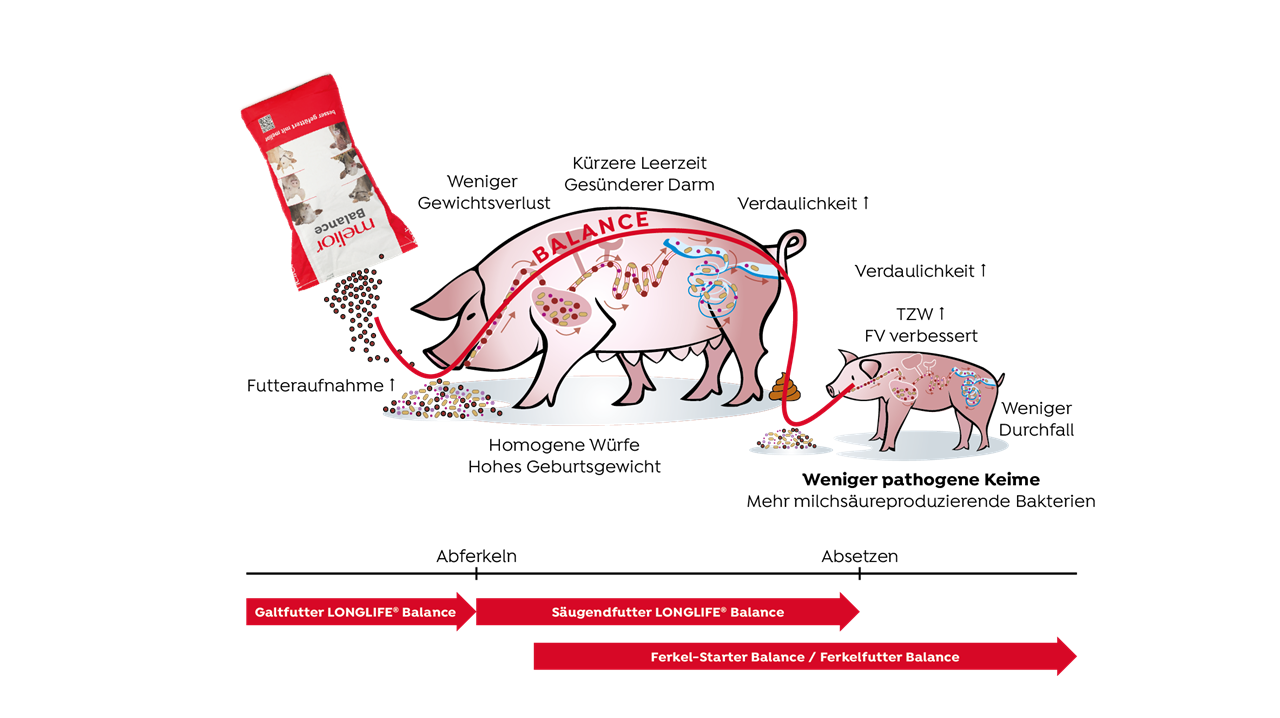 Ein gesunder Darm reduziert zugleich die Keimbelastung. Je besser die Verdauung funktioniert, desto weniger Erreger werden ausgeschieden, entscheidend für Ferkel, die in den ersten Lebenswochen sehr anfällig sind.